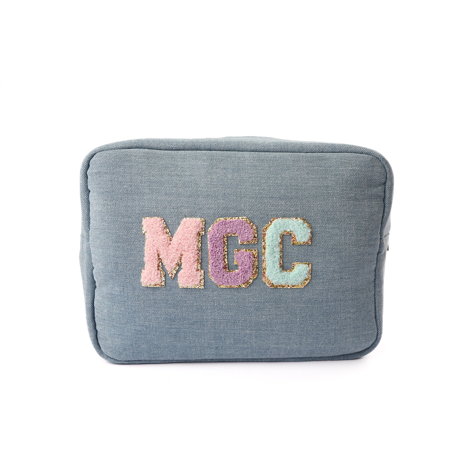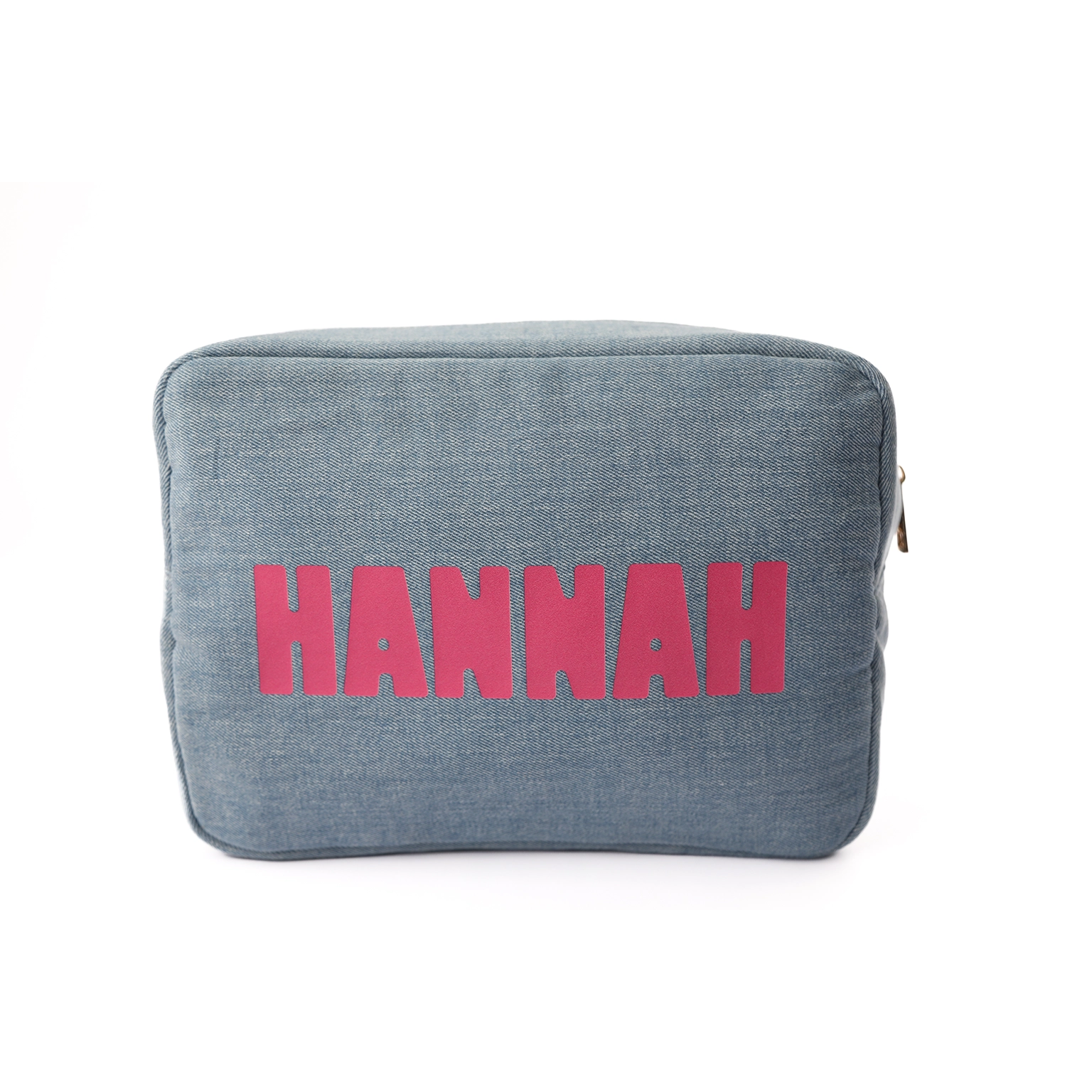 Our large denim personalised pouches are a stylish and versatile way to keep your essentials organised – perfect for use as a makeup bag, travel pouch or baby bag.