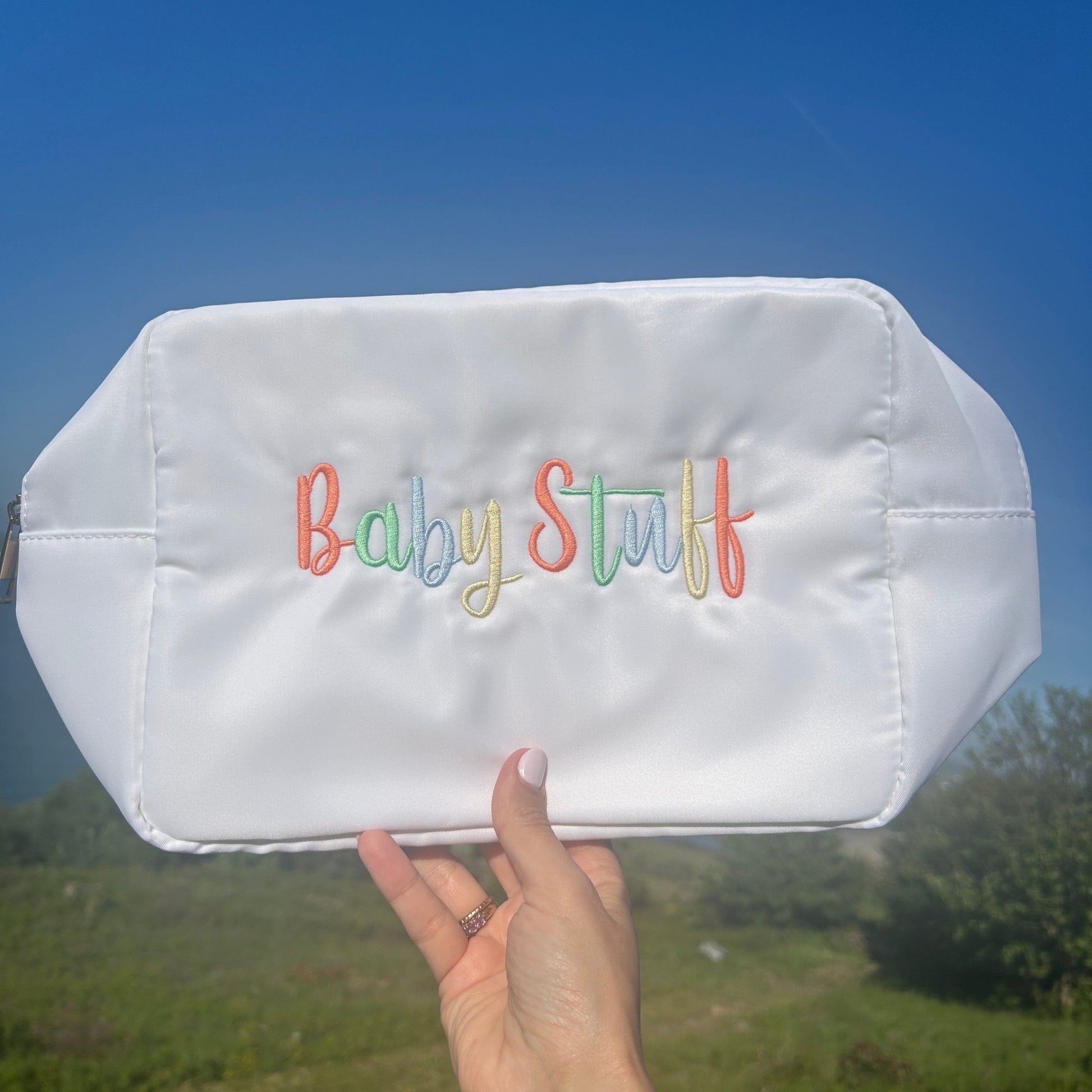 Make organisation personal with our Large Personalised Embroidered Pouch, perfect for keeping your travel, baby, makeup or hair essentials tidy and easy to access. Generously sized at 27.5cm x 12.5cm x 20.5cm, it’s ideal for holidays, hospital bags, nursery use, or simply keeping everything in one place day-to-day.